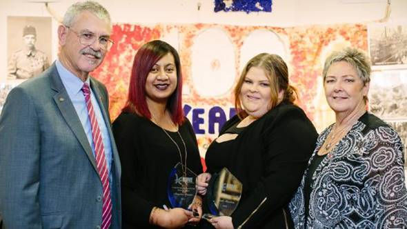 Award winners Angela Atonio (second left) and Sarah Mackin with Cameron Baird’s parents Doug and Kaye.